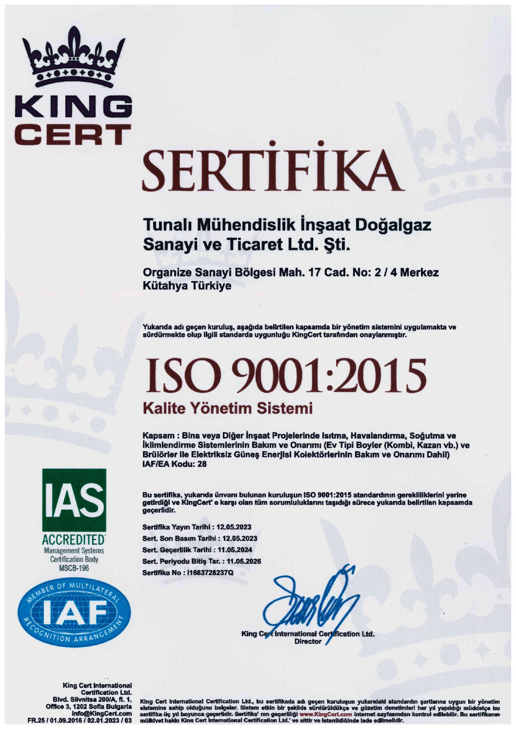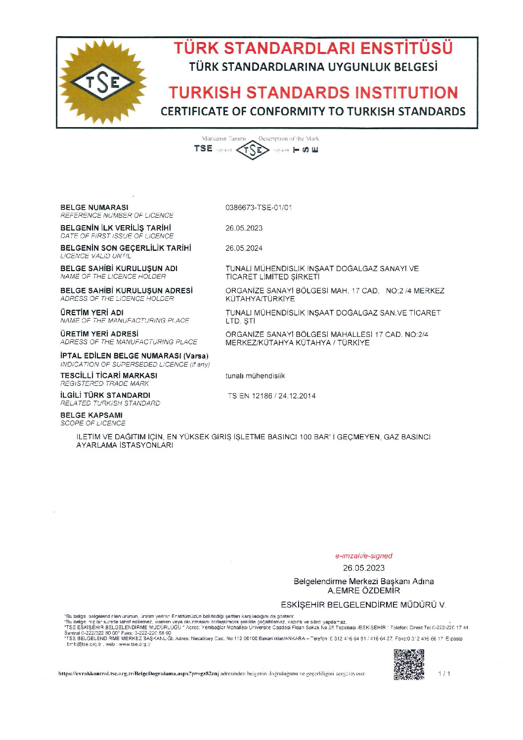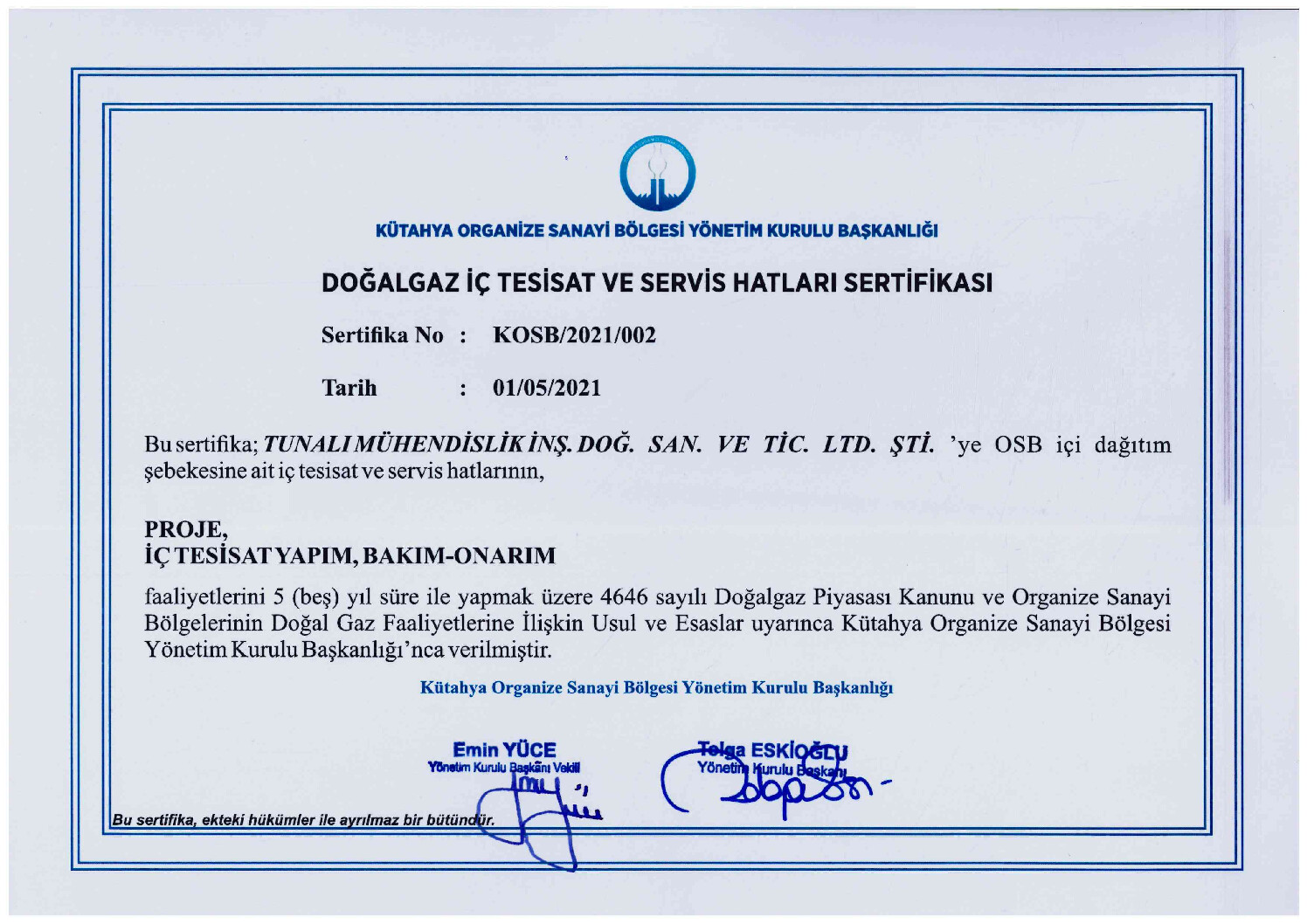 Tunalı Mühendislik olarak sahip olduğumuz kalite süreç belgeleri