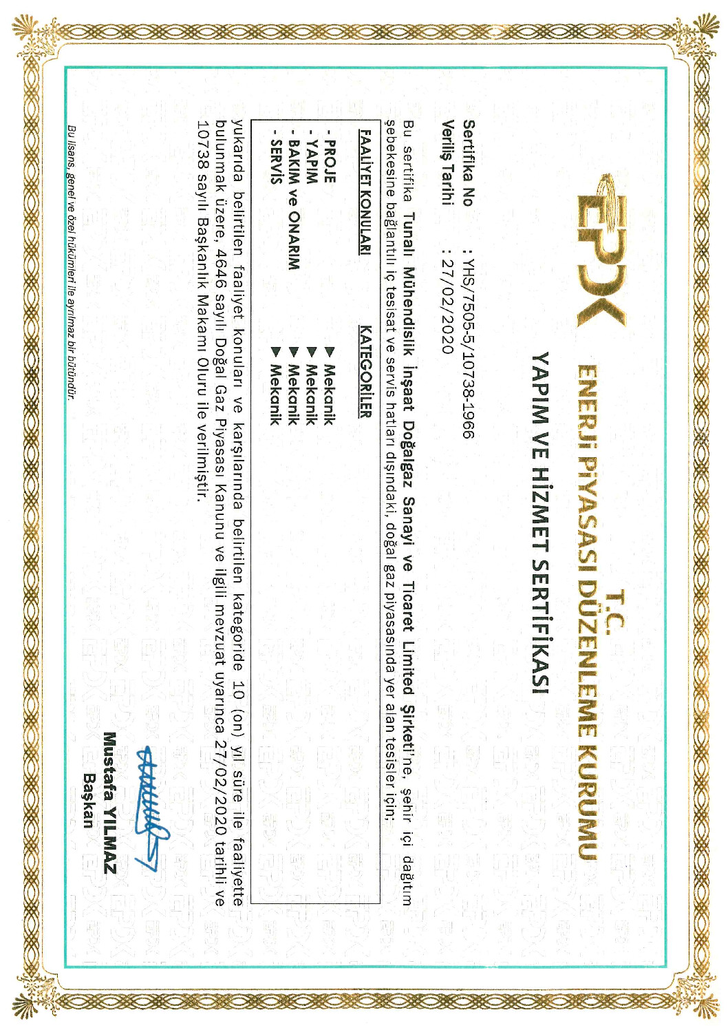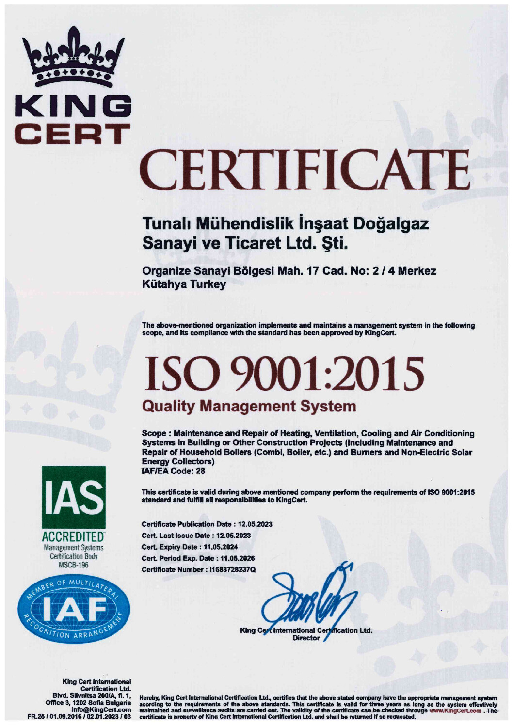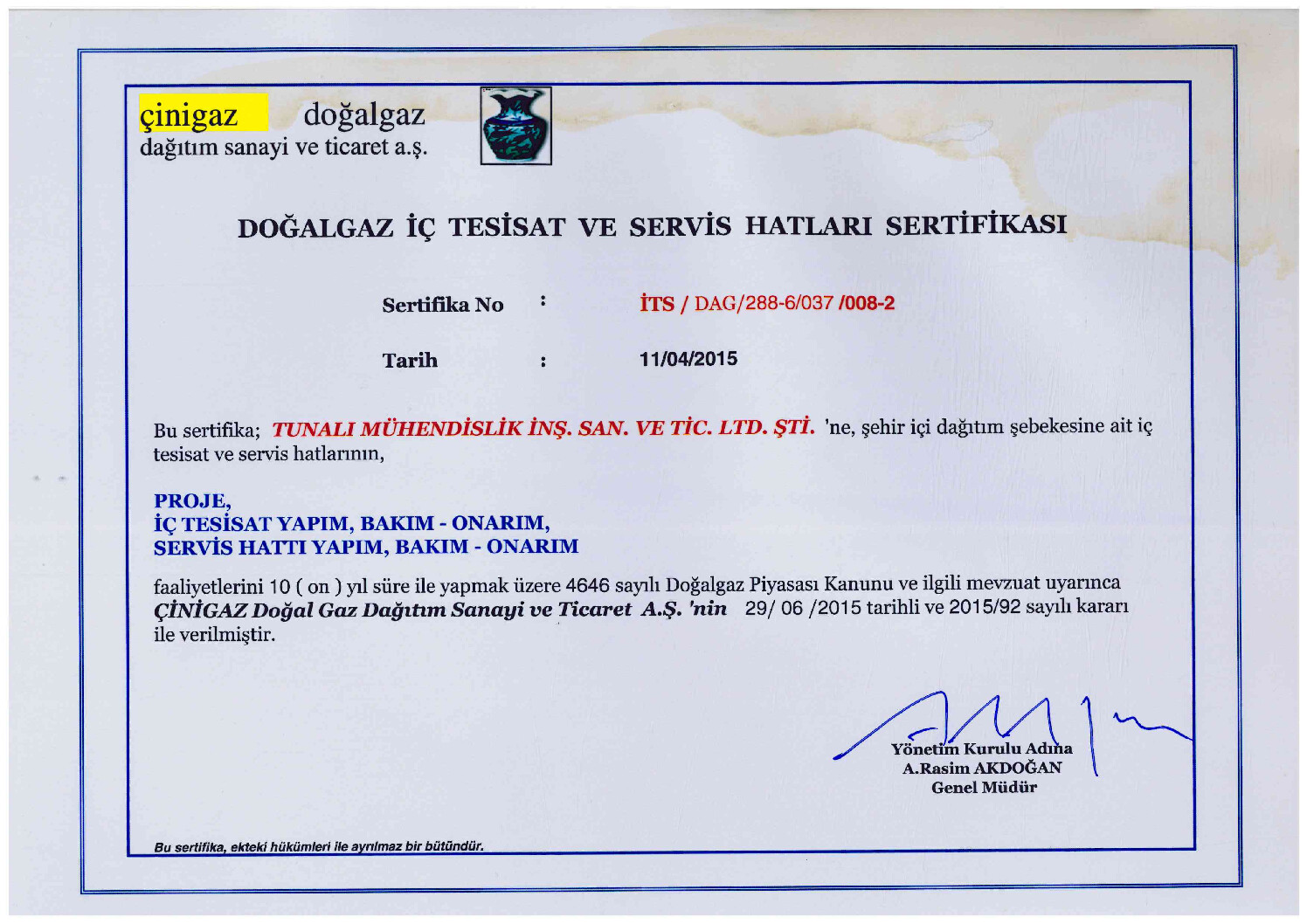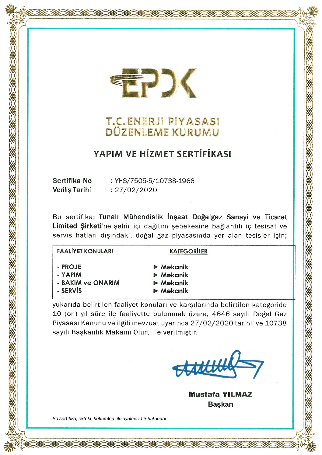 Tunalı Mühendislik olarak sahip olduğumuz kalite süreç belgeleri